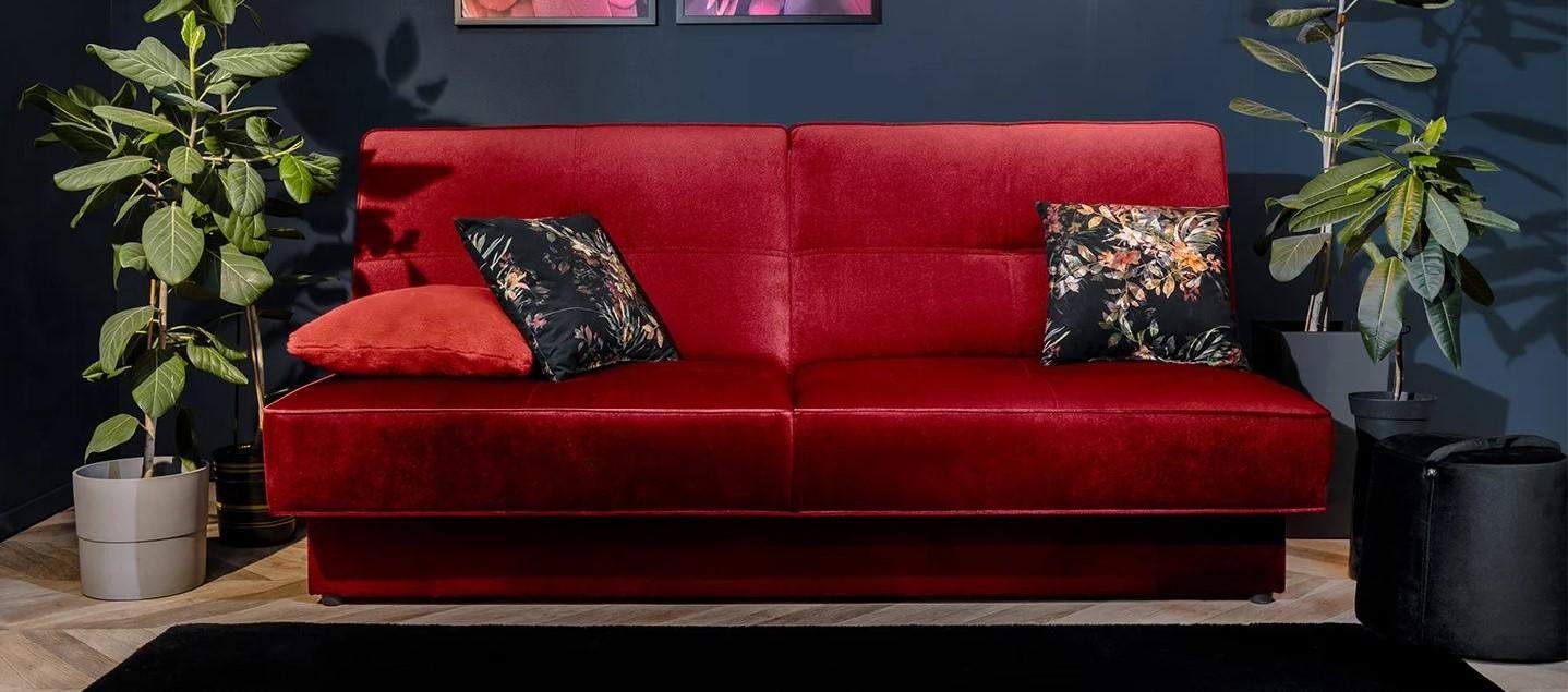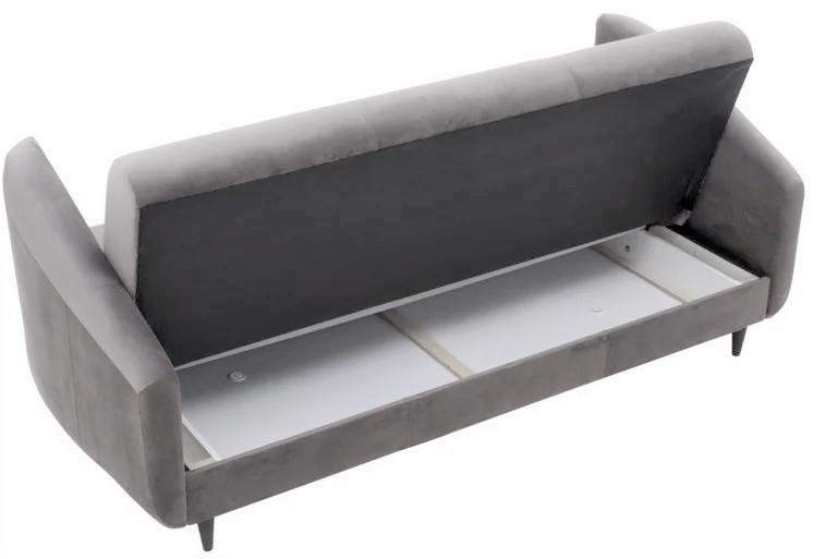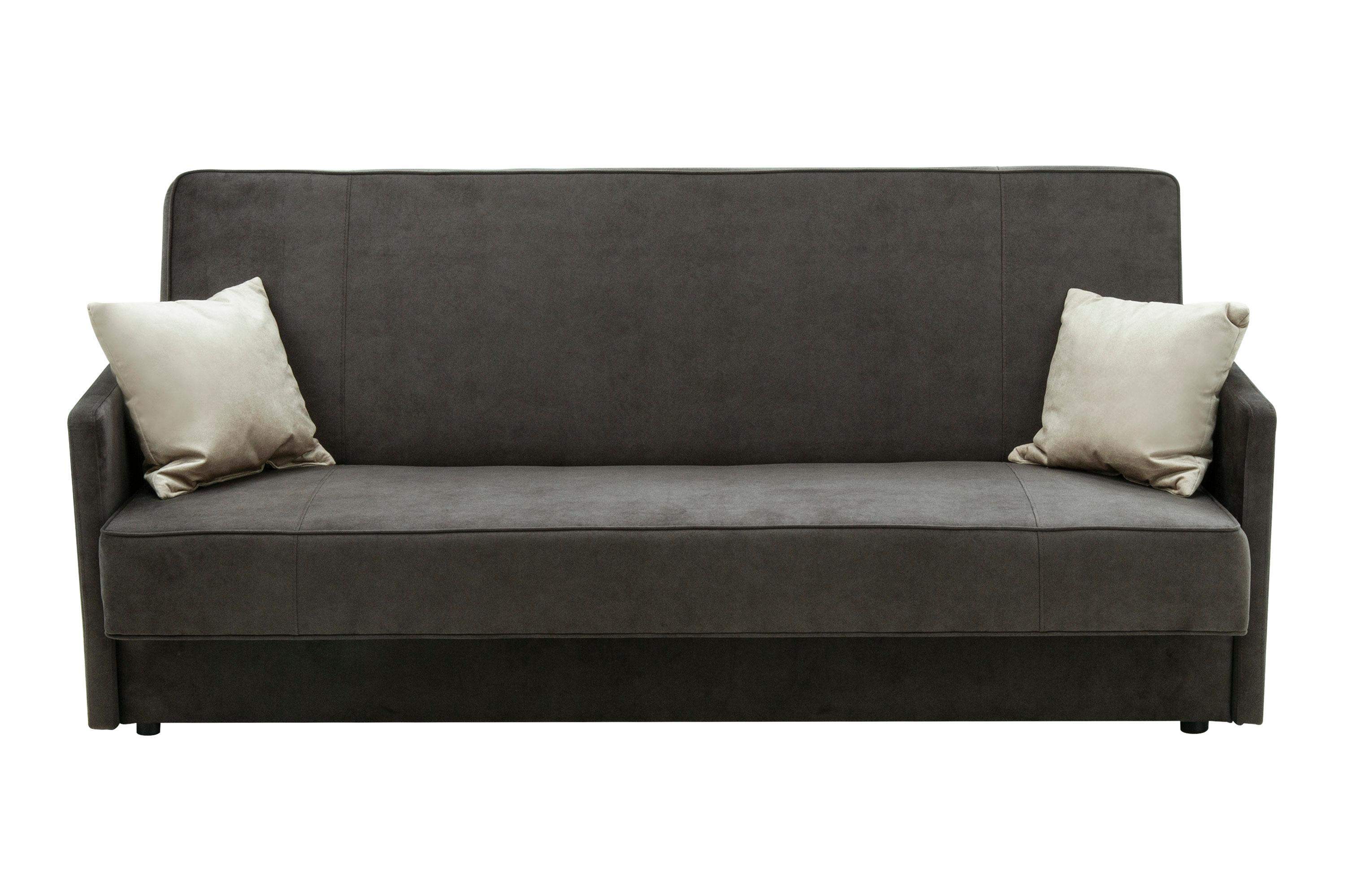 Komfortables Schlafsofa mit schrägen Armlehnen – ein Schlafsofa, das wie ein Sofa aussieht; Schlaffunktion + Stauraum für Bettwäsche; KOMFORT: Bonellfederkern;